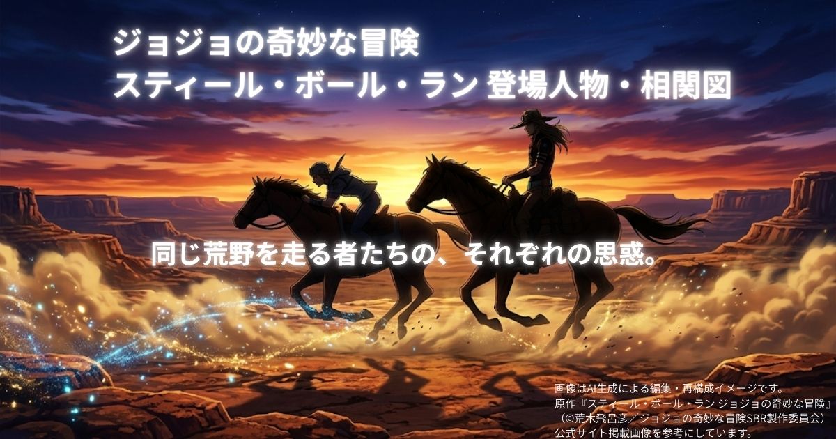 ※画像はAI生成による編集・再構成イメージです。 原作『スティール・ボール・ラン ジョジョの奇妙な冒険』(©荒木飛呂彦/ジョジョの奇妙な冒険SBR製作委員会)公式サイト掲載画像を参考にしています。