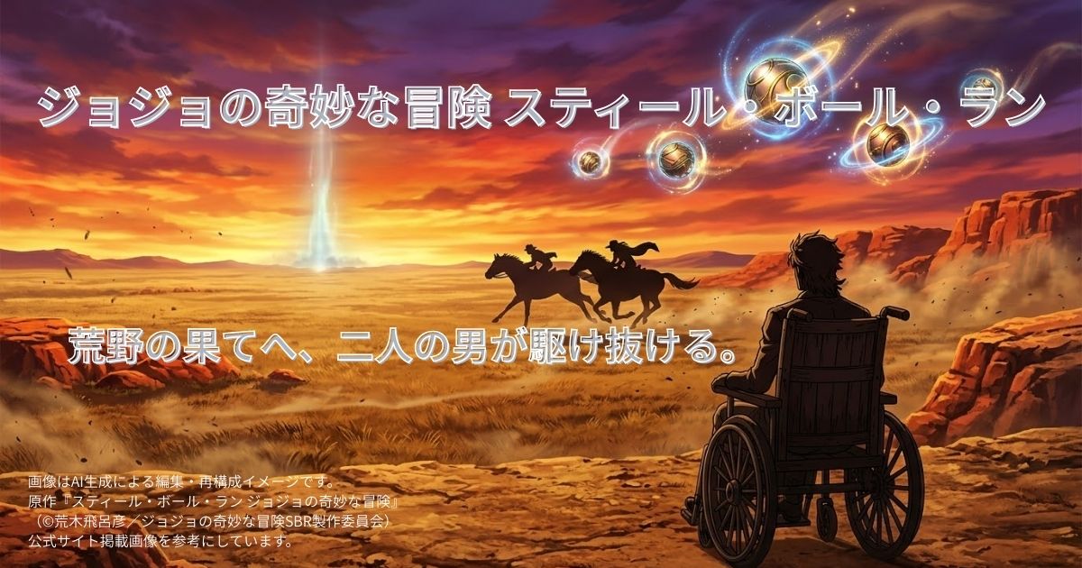 ※画像はAI生成による編集・再構成イメージです。 原作『スティール・ボール・ラン ジョジョの奇妙な冒険』(©荒木飛呂彦/ジョジョの奇妙な冒険SBR製作委員会)公式サイト掲載画像を参考にしています。